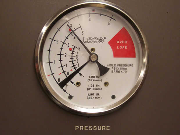 Turno Pulse el montaje. La máquina debe ahora comenzar a calentar y presionar la baquelita para montar la muestra. La presión debe aumentar para que el medidor de presión se mueve hacia arriba al punto rojo en la escala que corresponde al tamaño del molde como se muestra en la figura 8.