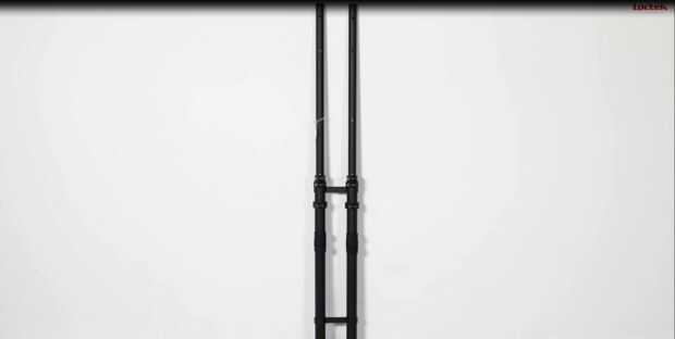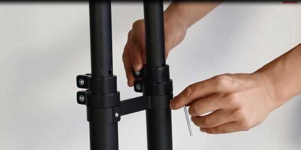 Los polos son altura ajustable; Siga la señal de advertencia para identificar la extensión máxima del poste. Utilizando una llave hexagonal, fijar la cerradura de seguridad, estabilizadores, anillos de estante de AV y guías de cable al poste central.