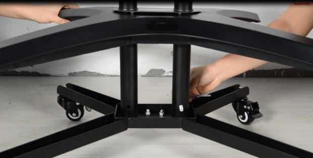 Aquí es la etapa más importante en el montaje de un medallón TV carro P3C. En primer lugar, deslice la cubierta de la base y la tapa alrededor de los polos de la parte inferior. En segundo lugar, deslice los polos en poste de soporte en la base. Finalmente utilice tornillos arandelas y tuercas para fijar los postes para el soporte de poste y fije la tapa de la base a las patas con tornillos. Ahora tienes una estructura estable.