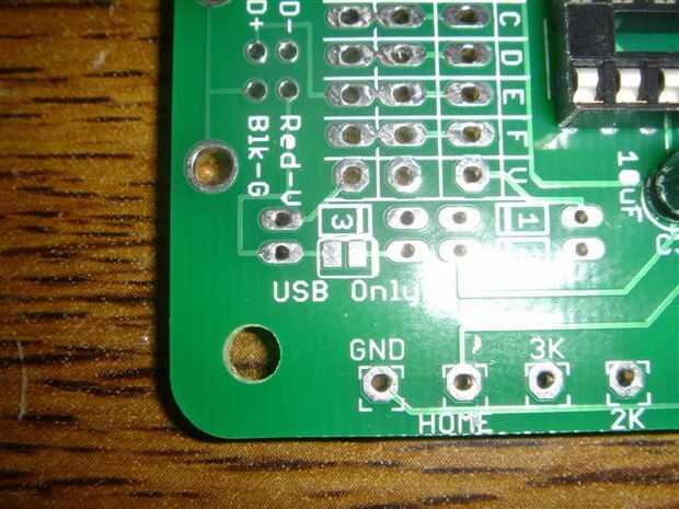 Si utilizas un Cthulhu original para Playstation 3 o PC USB solamente, entonces su equipo no debió haber llegado con cualquier diodos. Con el fin de asegurarse de que la Junta obtiene poder, usted necesita soldar entre sí los dos puntos etiquetados 'USB sólo', en la primera imagen. Esto es muy fácil de manejar, pero todavía debe hacerse. Calentar el soldador y prepárate para causar problemas. Derretir un gob obsceno de soldadura en el extremo de la plancha y usarlo para conectar las dos pastillas del puente con la etiqueta 'Sólo para USB'. Seguir adelante hasta que estás conectados. La segunda imagen muestra un puente terminado.