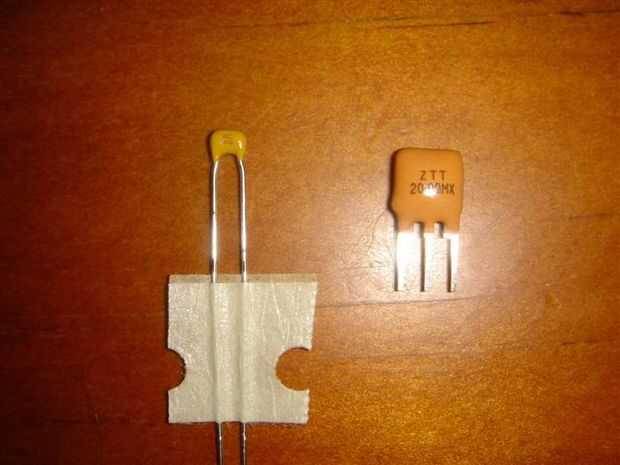 El condensador de cerámica es muy pequeño y tiene '104' escrito en letras que no podría ser capaces de ver sin una lupa. Lo principal aquí es que hay dos patas. La otra pieza, el resonador, es más grande, tiene 20 MHz' escrito al lado, y tiene tres patas.