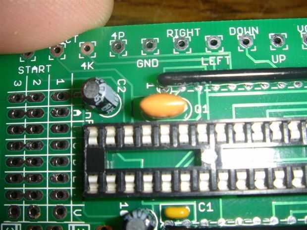 El resonador de tres patas se pone en el lugar marcado 'Q1'. No hay ninguna orientación; no se puede poner en ella hacia atrás, entonces ejecutar las piernas a través de los agujeros. Las piernas son un poco demasiado cortas para doblar así sujetarlo con un dedo y se voltea el tablero para que quede en el resonador con tres piernas asomando a través de la Junta.