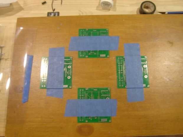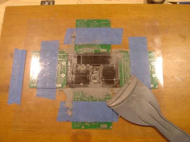 Cuadro 7. Después con cuidado tirando hacia arriba de tu plantilla y eliminación de los pcb se repita este proceso para la siguiente junta. Cuando termine se seguro quitar todo goma de la soldadura de la plantilla. Prefiero windex y un cepillo de dientes para eliminar algunos de los agujeros para los componentes de tono realmente apretado.