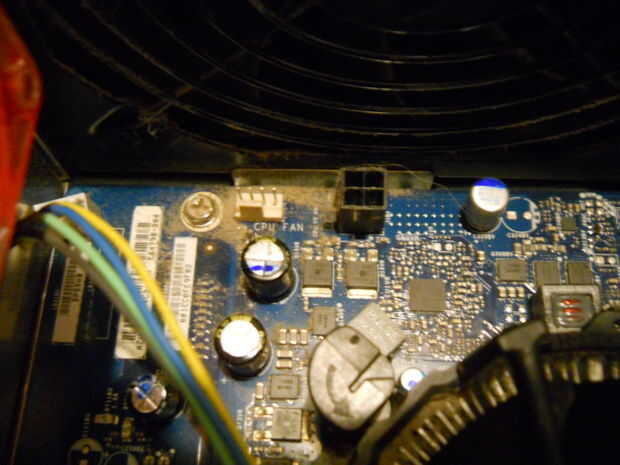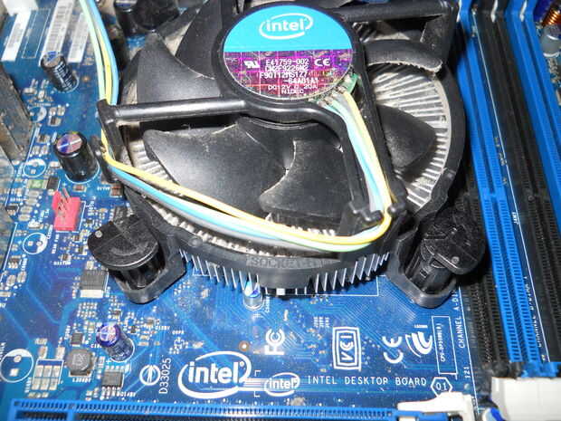En primer lugar, aplique pasta térmica en la parte superior de la CPU. Esto es un paso importante y es tan simple como que se separa la pasta siempre uniformemente entre la CPU y el disipador. A continuación coloque el disipador sobre el mecanismo entero de la CPU, alineando las clavijas de cuatro esquinas con los orificios en la motherboard. Al principio, los pernos deben girarse frente a las flechas y tienen completo rango de movimiento vertical. Una vez que los pernos estén alineados con los agujeros, aplique una presión firme hasta que usted sienta el pin "clic" a través del orificio de la placa base. Hacer esto para cada pin y luego gire cada pin en la dirección de la flecha para proteger el disipador de calor. A continuación, localice el adaptador de alimentación de 4 pines (etiquetado como ventilador de la CPU) en la placa base e Inserte el cable de alimentación (se muestra en los cuadros 2 y 3).