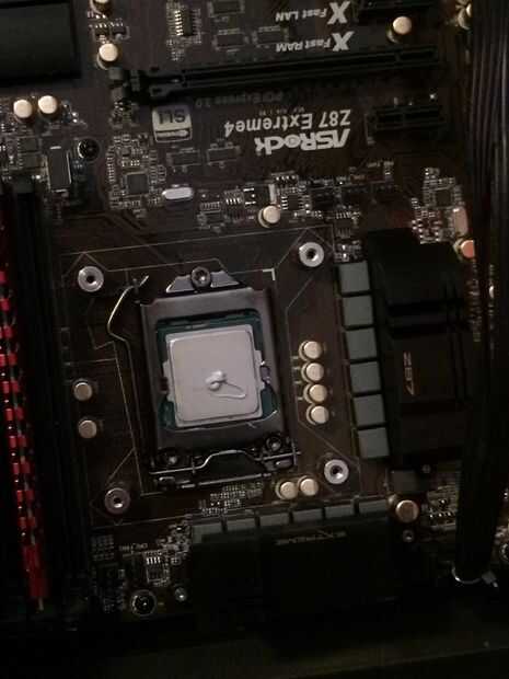 El siguiente paso es instalar el ventilador de la CPU. Aplique una pequeña cantidad de pasta térmica en la CPU. El método más común es aplicar sólo sobre un punto del tamaño de guisante en el centro de la CPU y extender suavemente a lo largo de la CPU hasta que cubra la parte superior de la misma.