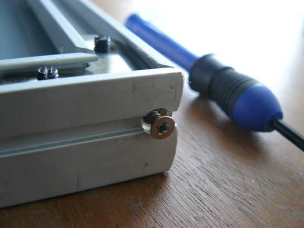 2. Afloje los tornillos de los soportes de esquina que sujetan los soportes de esquina en los canales superiores y laterales. (estos tornillos son muy pequeños así que asegúrese de que usted no pierda les)
