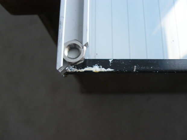 10. Empuje la pieza de extremo canal vuelva al panel asegurándose de que la el soporte de esquina se desliza en los largos canales. Apretar los tornillos en los soportes de esquina.