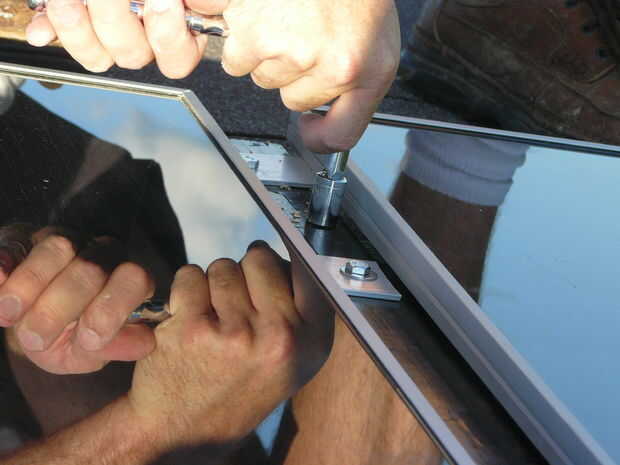 Luego ponen el medio y a los paneles de extremo superior en su lugar. Tornillo de fijación del panel en los rieles laterales de los paneles de los extremos que se están poniendo en medio de las lengüetas de metal.