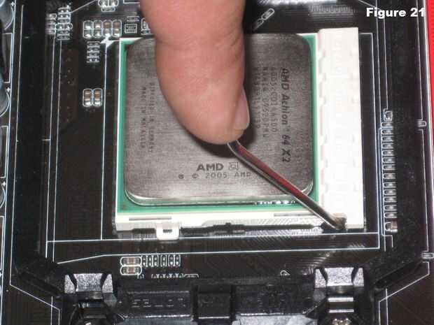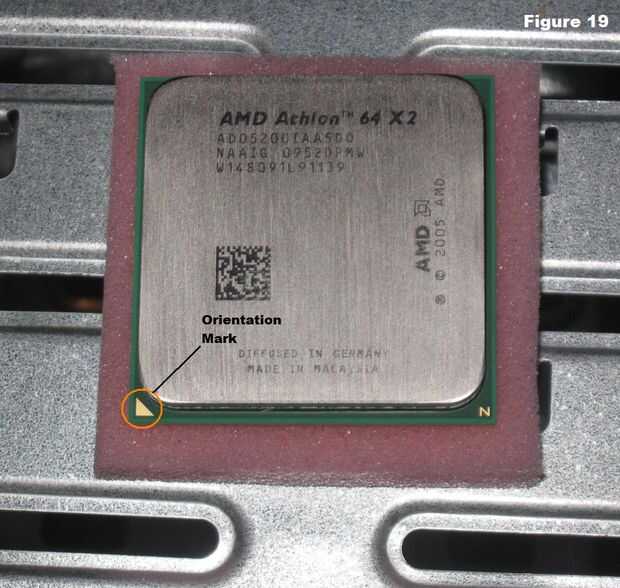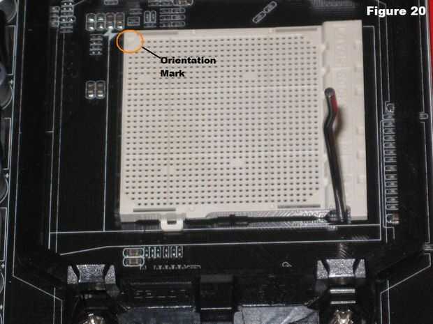 1. Encontrar la esquina de la marca señala el pin 1 del CPU como se muestra en la figura 19. En este procesador de marca AMD, la esquina es marcada con una flecha. Consulte la documentación del fabricante para obtener información específica acerca de tu procesador.