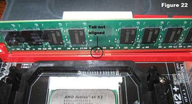 1. Sistema del tablero de RAM en el conector como se muestra en la figura 22. Verifique que la ranura en el tablero está en el lugar correcto. Si no es así, gire alrededor de 180 º.
