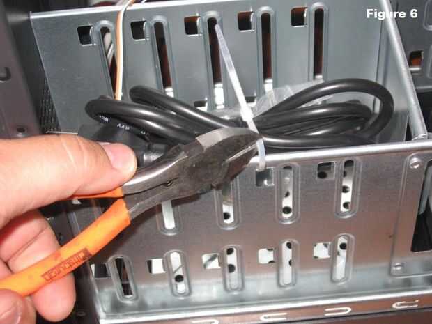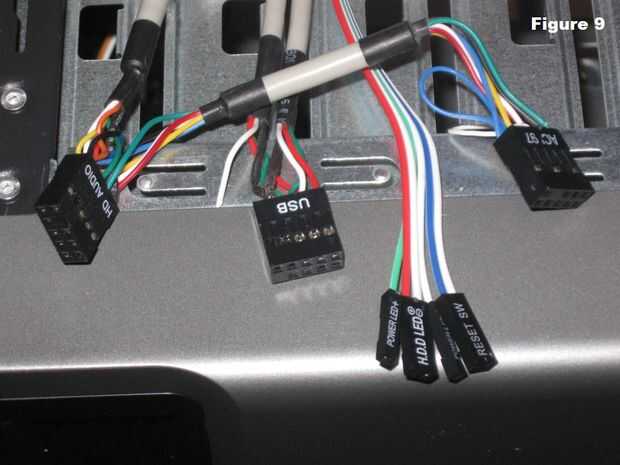 • Tome nota de los cables preinstalados en el caso. Estas deben ser las conexiones del panel frontal para características tales como el interruptor de encendido, conectores de audio y puertos usb. Si no están rotuladas, consulte la documentación del fabricante y etiquetarlos a ti mismo ahora antes de instalación otras partes en el caso (Figura 8).