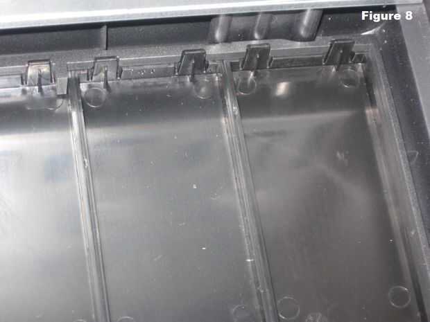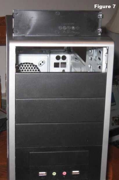 • Retire la cubierta de la unidad óptica. En nuestro caso, se quitar la tapa de la bahía más alta para montar nuestro disco DVD como se muestra en la figura 7. Para ello pulsando en las pestañas de retención que se muestra en la figura 8.