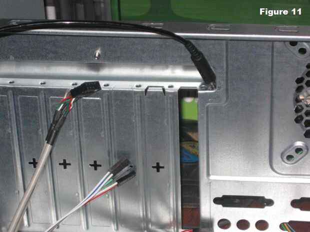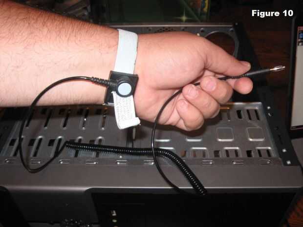 Poner la correa de conexión a tierra en la muñeca (Figura 10) y conecte el otro extremo a la caja del ordenador. Si la correa no está equipada con un clip para enganchar al caso, encontrar un lugar donde la cuña contra el metal como se muestra en la figura 11. Esto evitará cualquier acumulación de electricidad estática en el cuerpo de dañar los componentes de la computadora.