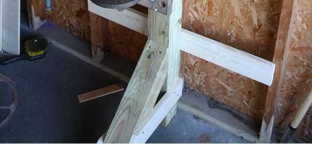 Corte 2 piezas de soporte de 1 x 4. Ya no debe ser de 16" con un 45 grados corte en un extremo. Atorníllelos en su lugar mantiene las secciones de 4 x 4 juntos. También Inserte los 2 tornillos en la parte superior de la sección 2'.