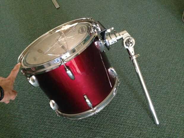 Ahora es el momento para conectar al tambor bajo. Hay dos ranuras ajustables en la parte superior del tambor bajo (Foto 3). El pequeño tom va en la ranura izquierda (desde la perspectiva del asiento) y el tom más grande va en la ranura derecha. Deslice el extremo largo del brazo (con el otro extremo conectado al tom) en el orificio. Deslice como lejos abajo como sea necesario para lograr una altura adecuada y luego apriete el tornillo para fijarlo (cuadro 4). Como el tom no es tocar el bombo, está muy bien (cuadro 5). Incline el toms hacia donde usted estará sentado.