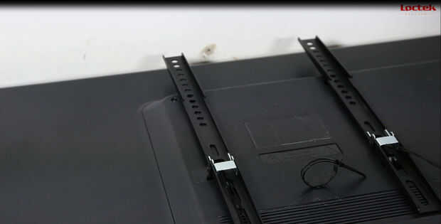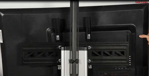Conectar los brazos de montaje en la parte posterior de su TV; Asegúrese que los tornillos están bien sujetados antes de colgar el televisor en el carro de medallón P2 TV. Después de ello, asegurar los cierres en la parte inferior de la montura se dedican y luego pegan las cadenas de versión de seguridad fuera de la vista.