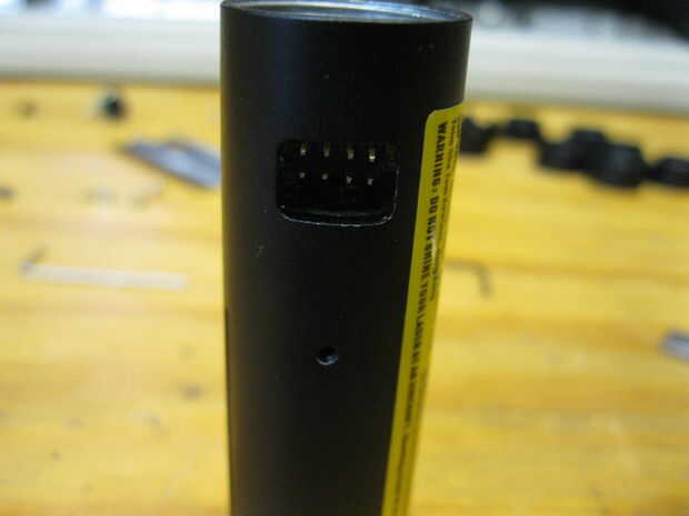 Una vez verificado tuck los cables de nuevo en el láser y empezar deslizando el conjunto de núcleo en su lugar. Asegúrese de que el encabezado se alinea con el agujero cuadrado en la parte trasera y el botón se ajusta en el agujero y el símbolo está alineado en la dirección correcta. La pequeña junta con el muelle terminal solo presiona en el extremo del soporte plástico del interior.