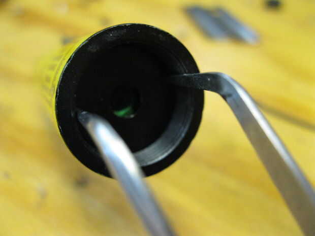 Siguiente paso instala el "anillo de retención de lente" (por falta de un nombre mejor). Si no tienes un par apropiado de óptica llave llaves como yo un par de pinzas trabajo bien. Antes de apretar el anillo hacia abajo hacer que el botón esté completamente en y en la rotación correcta. Asegúrese de que mantenga pulsado el botón mientras se aprieta el anillo de retención de lente. Apriete el anillo más allá de los dedos. Esto apriete el cuerpo del interruptor y manténgalo en su lugar.