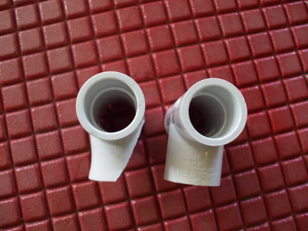 Quería que la pata lateral de la Tee para descansar completamente y firmemente alrededor del manillar. Las barras fueron ligeramente más grandes que 1/2" para que la camiseta realmente no encajaba bien. Uno a la vez utilicé una pistola de calor (o secador de pelo) para calentar la pierna del lado cortado hasta que estén suaves, luego obtura mi manillar. Mantenerla hasta que se enfría y se endurece o rociar un poco de agua en a que se enfríe. Este hecho de forma personalizada. Se puede ver en la foto que se ha extendido un poco la pata lateral de su tamaño original.