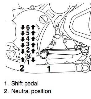 Nota: el patrón de cambio en las motocicletas es 1 para abajo y 5 arriba. El orden de engranaje de abajo a arriba es 1-neutral-2-3-4-5-6, como se muestra en las imágenes del patrón de cambio.