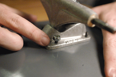 2. con los dedos empuje los pernos a través de la parte superior de la patineta y a través de los agujeros.