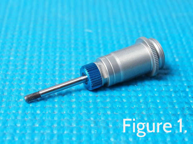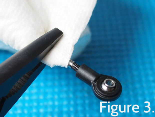 3. El eje de agarre con unas pinzas y enrosque el extremo de la varilla en hasta hilos no son visibles. (Figura 3). Nota: Si no utilizas pinzas de eje de choque es importante cubrir el eje con algo para evitar rayarlo. Una toalla de papel había doblada sobre sí misma un par de veces funciona bien.