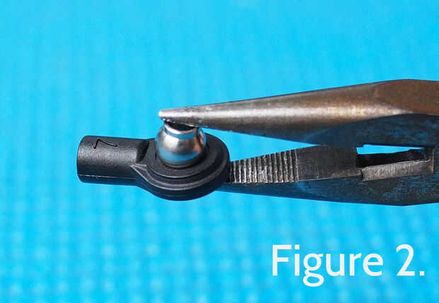 2. Utilice pinzas para ajustar el extremo de bola en el extremo de la varilla, como se muestra en la figura 2. PRECAUCIÓN: Coloque la bola en el lado del extremo de la varilla con el borde escalonado alrededor del orificio, como se muestra en la figura 2. No hacerlo puede causar el extremo de la varilla romper.