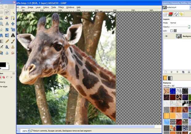 Una vez que ha cortado la cabeza de la jirafa, haga clic en dentro de él y haga y luego copiar. Volver a la imagen de la tortuga y haga clic derecho e ir hasta las opciones donde dice "pestañas acoplables" destacar que y abrir los canales uno y capas.