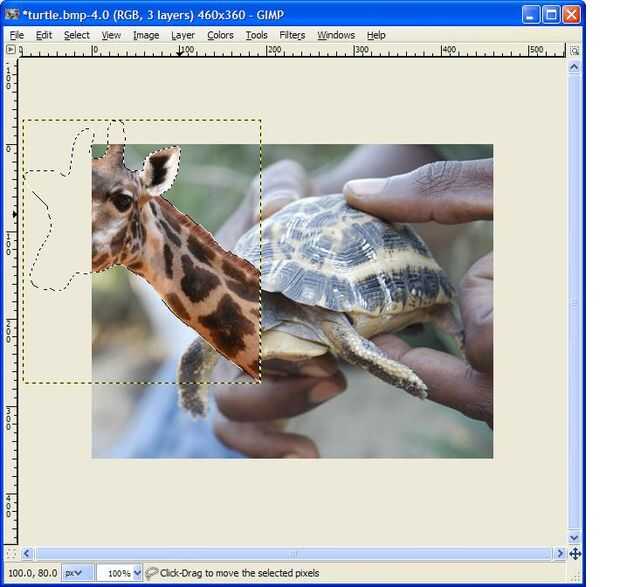 OK ahora que haya pegado la cabeza girraffe encima de la imagen de la tortuga, vas a querer cambiar el tamaño. (vea las fotos de los lugares de todo)