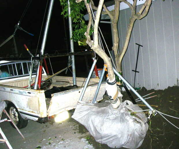 Deslice un encerado y un consolador debajo de la bola de la raíz y atar firmemente en su lugar con innertubes. Envolvemos el paquete entero con cuerdas para mantenerla segura y firmemente.