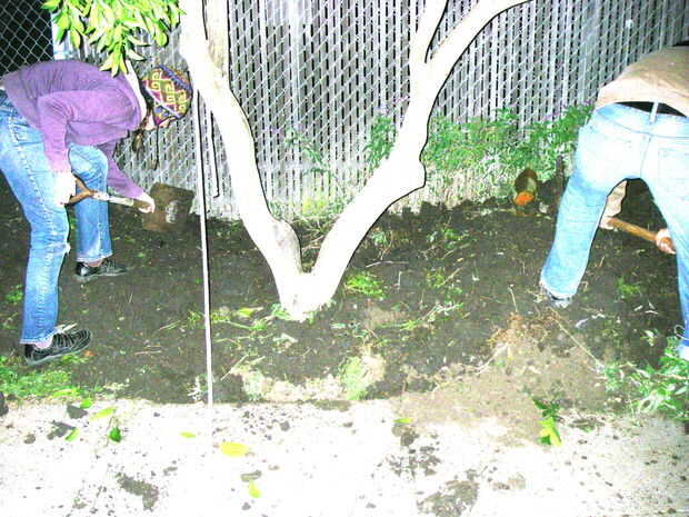 cavar alrededor de él y cambiar y llenar para nivelarlo. Tiramos los ganchos hacia fuera y relleno alrededor de la bola de la raíz con tierra.