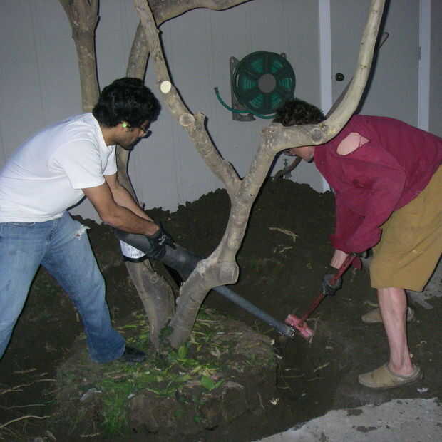 Libra los ganchos debajo de la bola de raíz para que lo apoyen mientras levanta. Si solo tira en el tronco del árbol podría tirón fuera de la tierra como una gran maleza. No sería una buena forma de mantenerlo vivo.