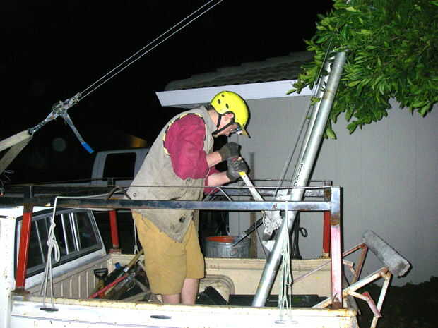 El cable de boom ya se rompió una vez antes de esta foto fue tomada. Accidentalmente fue preparado sobre una cosa afilada que corte. Afortunadamente la parte posterior barra del camión de madera estante impedido que martillar demasiado el árbol, y todo el mundo estaba claro.