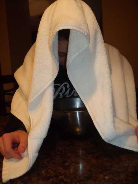 Cubre tu cabeza con una toalla de baño grande. Después de esto, se incline sobre el recipiente y respirar profundamente. Al menos diez minutos, pasar el tazón de fuente.