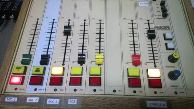 Al grabar en el stand de noticias, usar Mic 3. Este es el micrófono más cercano a las computadoras. Haga clic en el color amarillo "A" botón (se ilumina cuando esa olla está encendido) y presione el control de volumen para el micrófono (pote lo para arriba) cerca de la línea negra en el tablero. (Personalmente, prefiero tener mi mic un poco encima de la línea, pero puedes experimentar para encontrar qué nivel funciona para usted usar los auriculares).