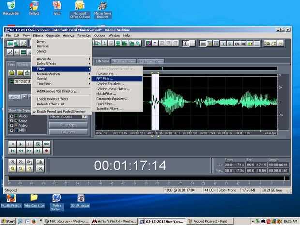 Una palomita plosive es lo que pasa cuando alguien está hablando directamente en el micro y envía una ráfaga de aire rápida, dura. Esto sucede generalmente con duro s. "p" (usted puede sentir esto cuando ponga la mano delante de la boca y decir "hecha estallar plosive.") En el ejemplo resaltado aquí es realmente la "th" en "trece." Es como un golpe a los oídos. Usted oirá antes de que veas. Cuando acerca lo suficiente para verlo, se puede reparar.