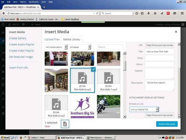 8. Resalte el texto para el clip de audio que desea reemplazar y haga clic en Añadir medios otra vez. Busque el clip correspondiente, seleccionar y cambiar su título (a la derecha de la ventana debajo de URL) a algo así como "Haga clic aquí para escuchar [nombre de la persona que habla en la grabación]". Desplácese hacia abajo hasta la sección configuración de pantalla de datos adjuntos y haga clic en el menú que dice incrustar reproductor desplegable y cambie a Link a archivo multimedia. Por último, haga clic en insertar en el Post. (Puede tomar un tiempo para el programa insertar el enlace en el post. Sea paciente y no haga clic en cualquier lugar en la historia hasta que el texto resaltado ha sido sustituido por el título dio el archivo de los medios de comunicación en texto azul.)