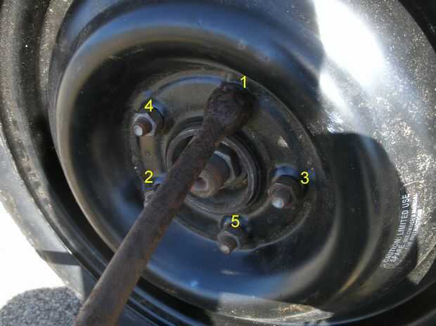 Coloque la rueda de repuesto sobre el eje de la rueda del mismo modo que sacó la otra rueda. Reemplace las tuercas de les apriete con los dedos y apriételos en un patrón de estrella como se muestra en la imagen siguiente. Luego apriete otra vez, sólo para asegurarse.
