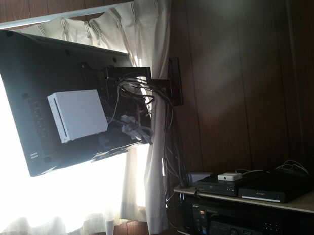 Decidí ocultar mi Wii detrás de la TV porque no quiero que sea obvio que tenía una Wii y porque es tan simple, los controles remotos usan bluetooth por lo que no necesita línea de visión a usar.