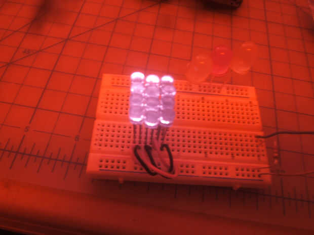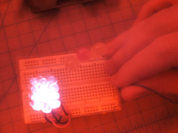 Por último, me acordé de mi discusión anterior con Dan que se sentían que esto podría trabajar si todos los LEDs se apunta directamente a la cara. Apunta IR LEDs de alta intensidad directamente en tu cara no puede ser una buena idea, pero yo cerré los ojos y había intentado de todas formas. Hubo poca diferencia sensible.