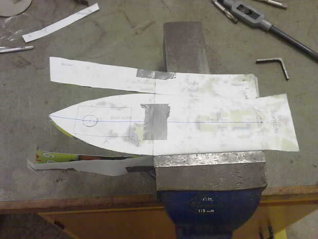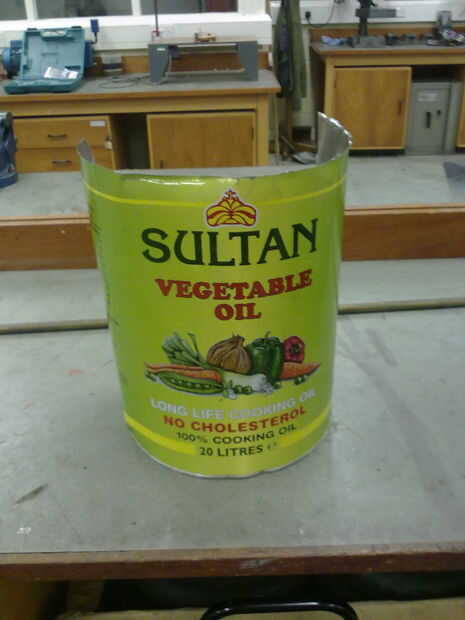 utilicé el patern de casco de un sitio web de barco pop pop que utiliza el acero de un tambor de aceite vegetal. El tambor fue abierto con un abrelatas y una hoja plana fue extraída usando un pait de esquileos de metal. El patern se imprimió y pegada en el metal con un palo de pegamento tack bajo y corte usando tijeras. El golpeteo entonces fue quitado y todos los pliegues antes del casco fue sellada con abundante cantidad de areldite.