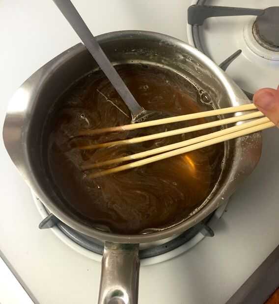 A continuación, apartar el almíbar y deje que se enfríe. Esto es importante porque una vez, sumerja los pinchos de azúcar en la solución, puede disolver si el almíbar está todavía caliente.