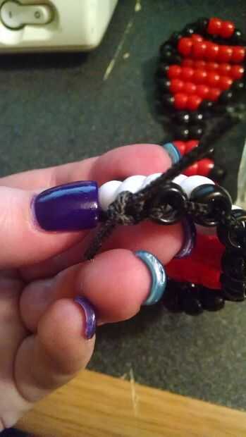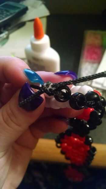 Un nudo en el extremo del último grano. Asegúrese de atar firmemente. Es mejor hacer un nudo doble. Una vez que crees que el nudo está apretado, se necesita el pegamento otra vez. A ambos lados del nudo, tienes que poner una cantidad generosa de pegamento. Deje que se seque un poco y luego, puede comprobarlo para asegurarse de que es difícil en el frente y la espalda. Si necesario, agregar más pegamento.
