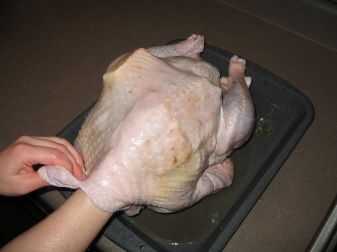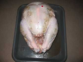 El pavo necesita un poco de preparación. Deben eliminarse las menudencias y el cuello. Doblar las alas de Turquía tras el pájaro (es decir, poner el pájaro en un full-nelson). Si inyectan con la marinada, inyectar la noche antes hasta una hora o tan antes de cocinar. Sal y pimienta al exterior e interior de aves. Antes de cocinarlas, dividir el palillo de la mantequilla por la mitad. Empujar una mitad entre la piel y la carne sobre cada pecho.