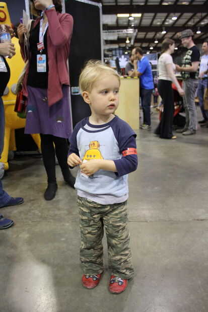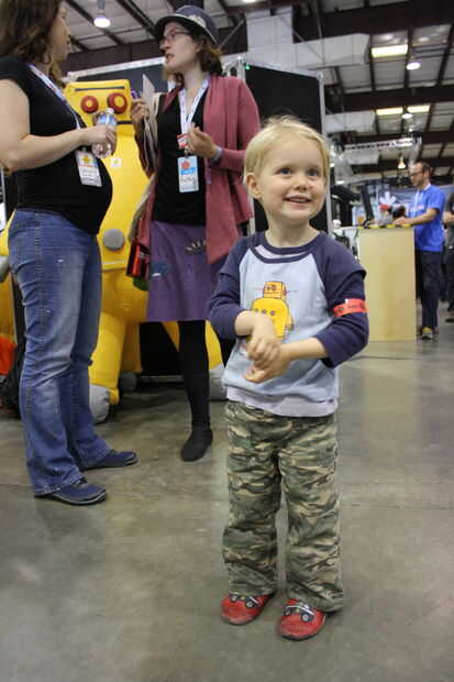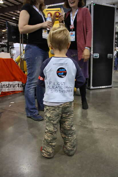 En el 2012 San Mateo Maker Faire, escribí mi número de teléfono en la parte posterior de su camisa, así que cuando ella lo hizo, la gente agradable corriendo un stand sobre robots me podrian dar una llamada. Su camisa fue un arranque de gran conversación. En cada lugar solo nos detuvimos, otro padre comentó en su camisa y me dijo sobre el tiempo que perdieron a su hijo.