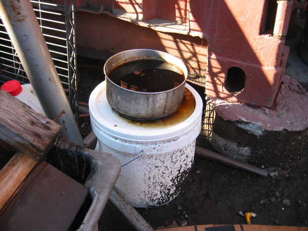 Aceite flota en el agua. Así que si dejas un cubo de drenaje aceite de un cambio de aceite automotriz en la lluvia, el agua de lluvia se hunde hasta el fondo y el aceite se vierte por encima. Si el aceite tiene un montón de aditivos habrá alguna mezcla y usted obtendrá algunos gris pardo petro-mayonesa en su vertido.