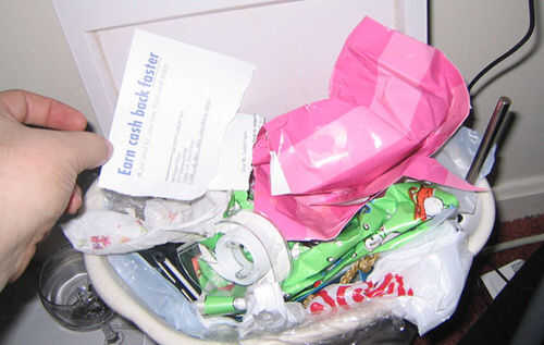 Si usted participó en el paso 4, lanzar su información de contacto en la basura. Como se puede ver, yo estoy recogiendo papel de embalaje, cinta, bolsos blanco, una barra de metal y un scanner desmontado en mi papelera. Vaciar la basura es totalmente opcional.