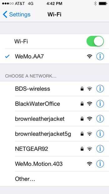 Terminarás haciendo esto por el movimiento y la energía. Cada dispositivo WeMo se demuestran para arriba como un WiFi en sus teléfonos ajuste así cerrar la App WeMo e ir a la configuración de su WiFi, conectar a uno de los puntos de acceso de WeMo como si se tratara de un WiFi público.
