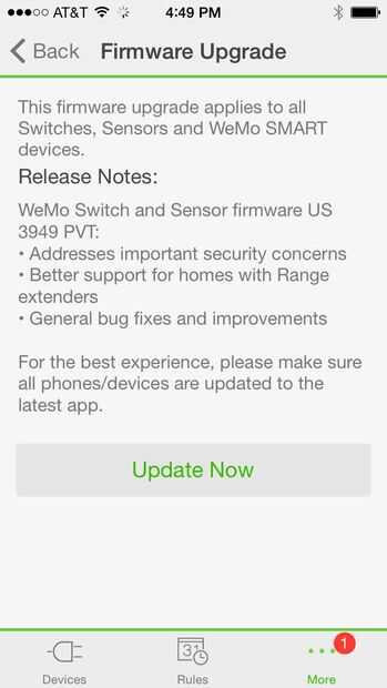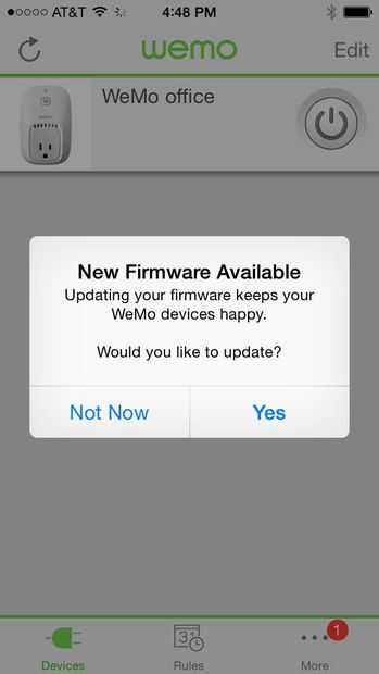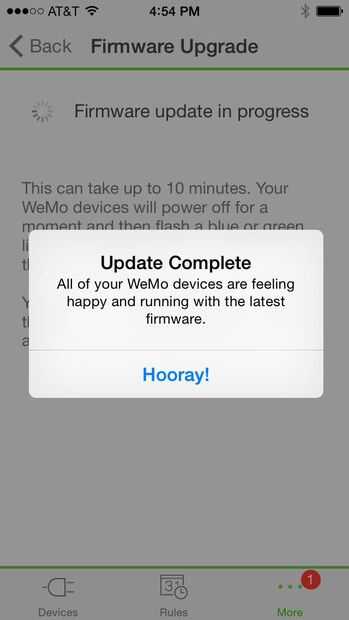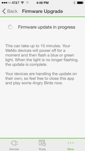 WeMo constantemente realiza mejoras en el software que se encuentra en el dispositivo. Así que Tómese un momento y actualizar el firmware si se le solicita.