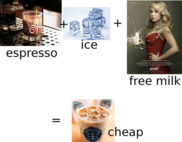 Por este precio, puede añadir fácilmente un jarabe con sabor a (~ $0,25) y todavía hacer como un bandido. Pero, darse cuenta de que no está haciendo nada shady / chunga / mal (moralmente o legalmente). Simplemente son pedidos fuera de su menú y usted mismo ayudando a la leche.